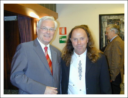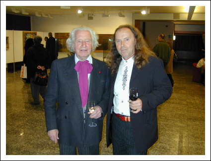 Dr. Karl Nicolussi Leck, Direktor des Bildungszentrum in Bozen und Künstler Amadeus Bortolotti, anlässlich der Ausstellung von Reiner Schiestl, 2003.