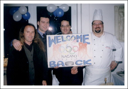 Amadeus Bortolotti mit Eishockeystar Robert Oberrauch, Vizebürgermeister Dr. Elmar Pichler Rolle und Koch Andreas, Zurück von Nagano, Italien Weltmeister in Eishockey